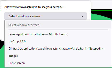 Use the Video source pulldown menu to select your video input device. The list will be populated with all of the video sources detected. You may be prompted to allow flowcaster.live to access the video input device.